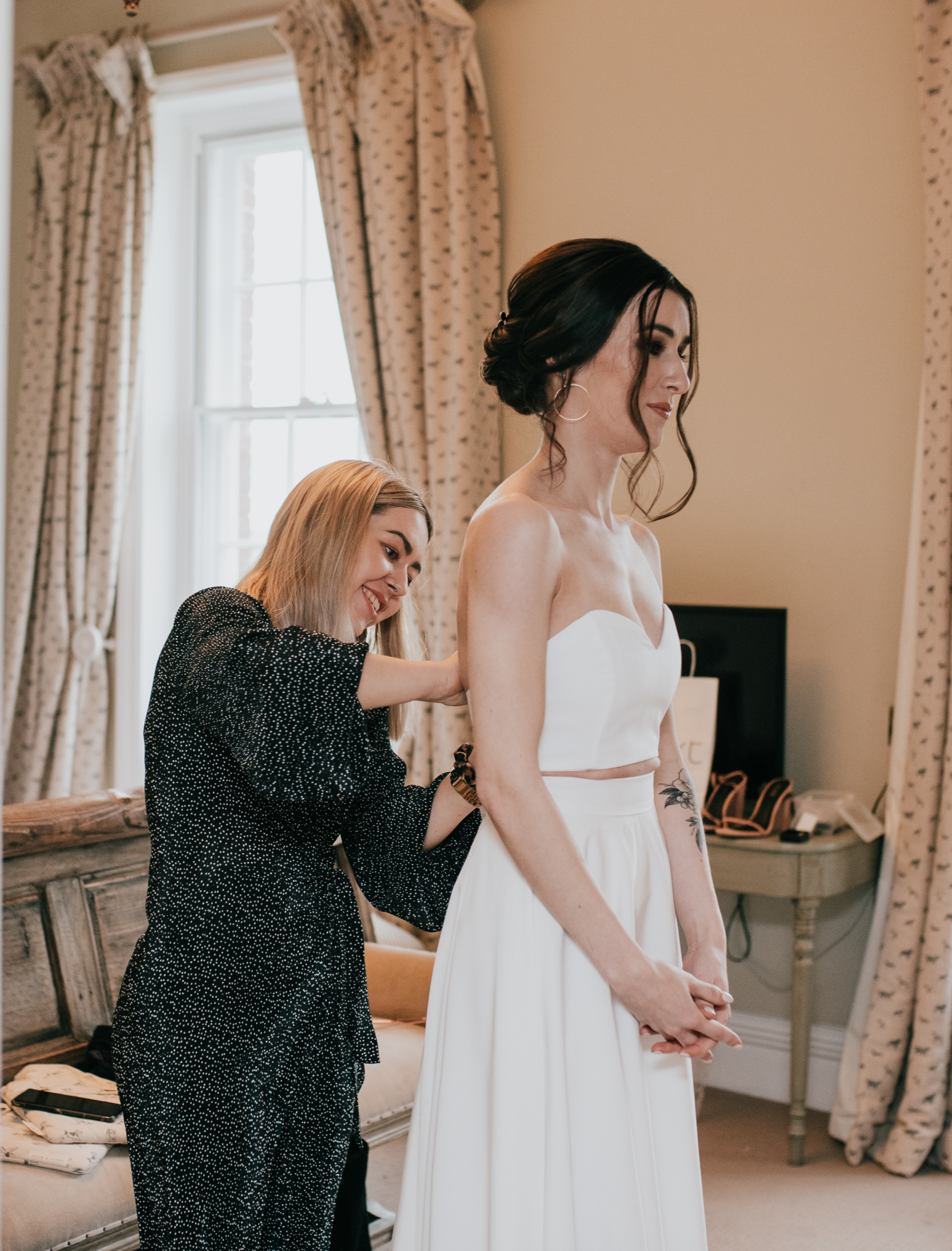 Brides are invited to get in touch using the button below to arrange the initial fitting, with advice to book no later than 10 to 12 weeks before the wedding date. This ensures time for careful alterations and multiple fittings if required. Timelines shorter than this can be achieved depending on availability but will incur a 20% surcharge.
